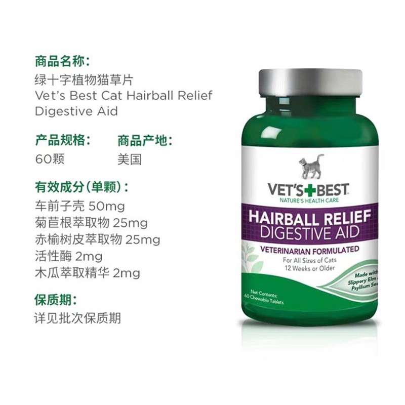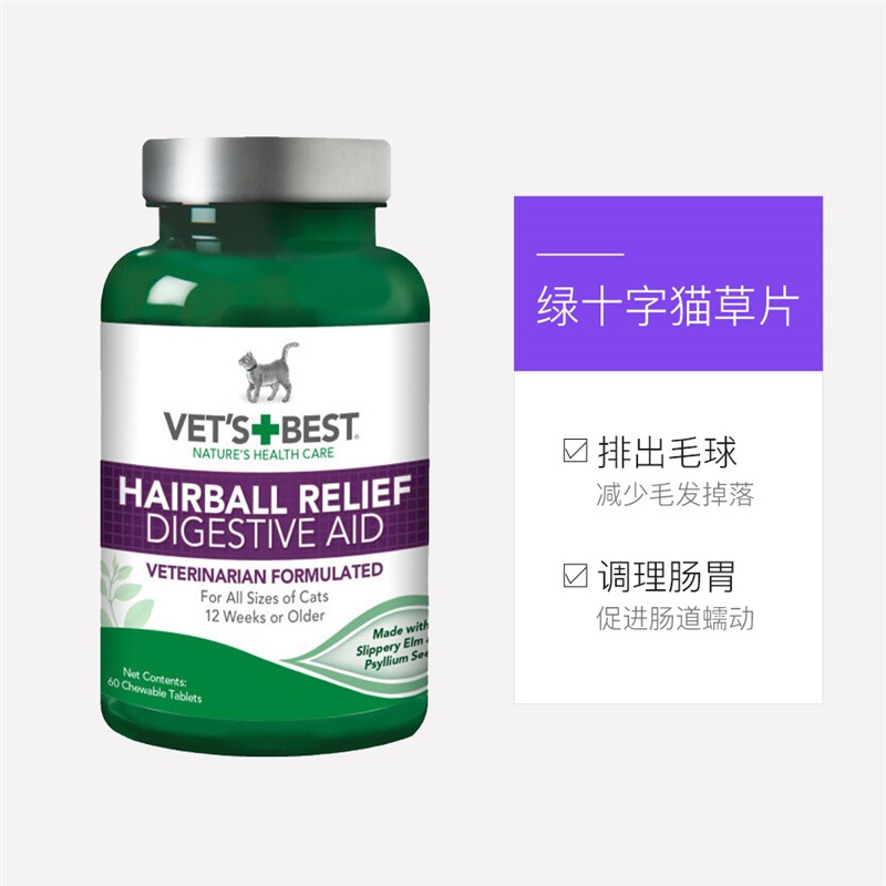 VET'S BEST天然绿十字 猫用化毛片 猫草片 辅助治疗毛球症 60粒
